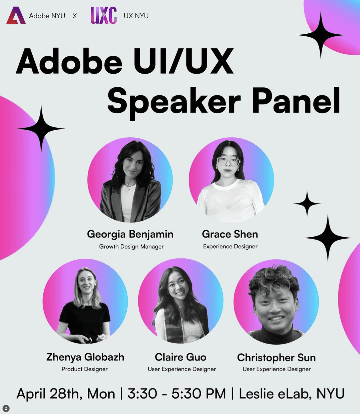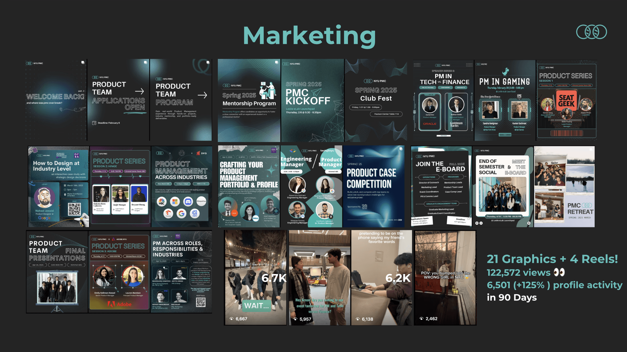 At NYU Product Management Club, led visual branding and event campaign design with Canva and Adobe CC, driving a 125% increase in Instagram engagement through original reels and strategic content. Developed sponsorship decks and outreach materials for campus and industry partners.